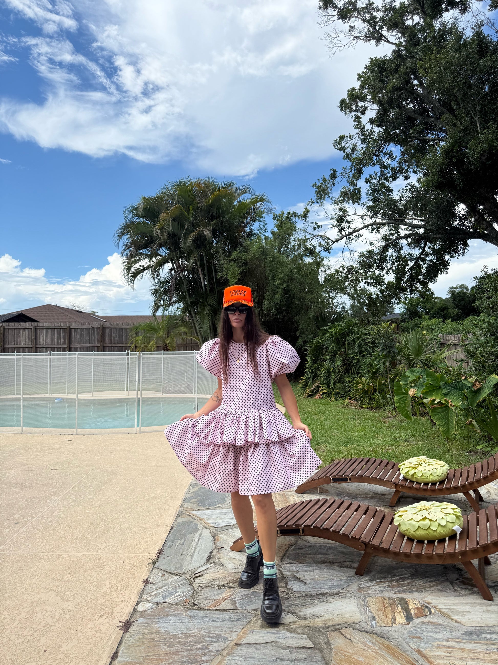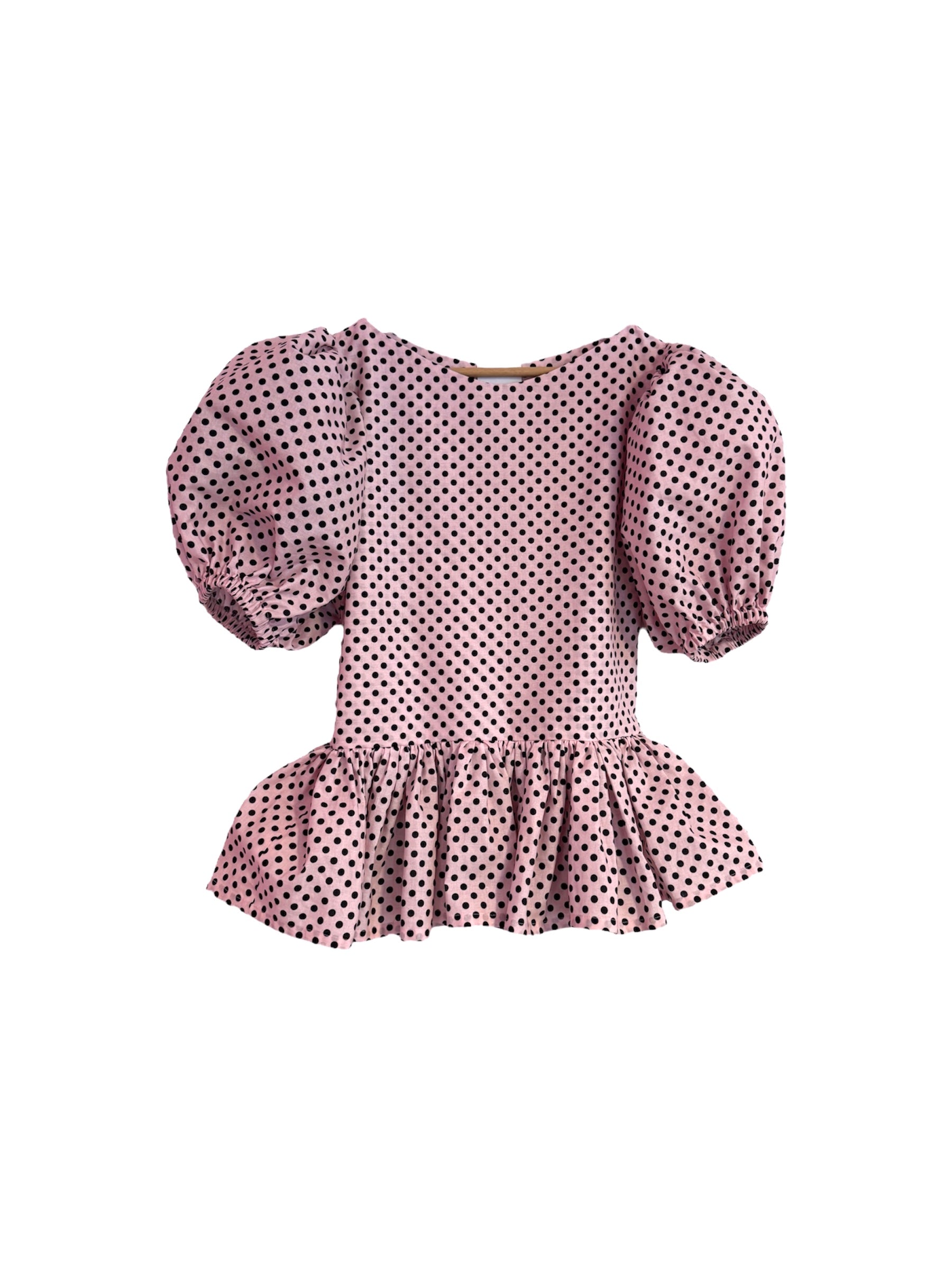 Made from lightweight blush fabric with black polka dots. Not vintage but is made to order.