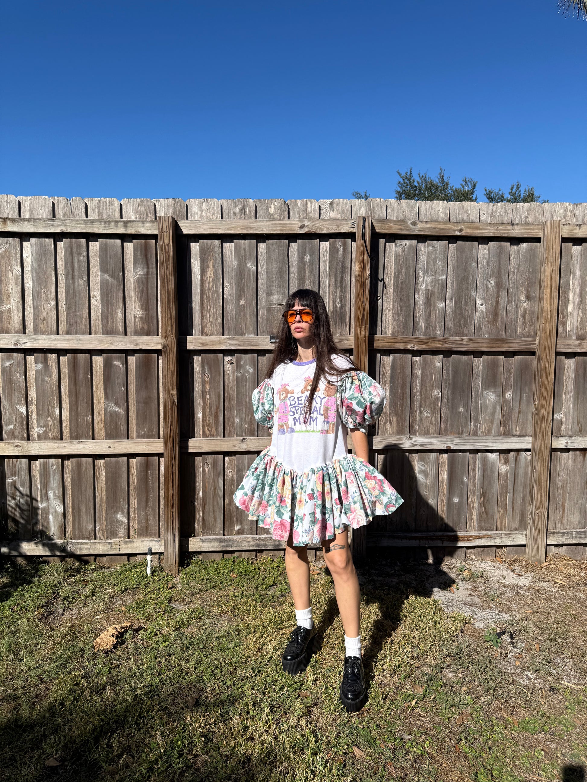 Vintage Sleep shirt "one size” with added puff sleeves and ruffle at hem made from vintage floral sheets. Sleep shirt slightly take in at sides and ruffle comes to a V in front and back for a more feminine fit.