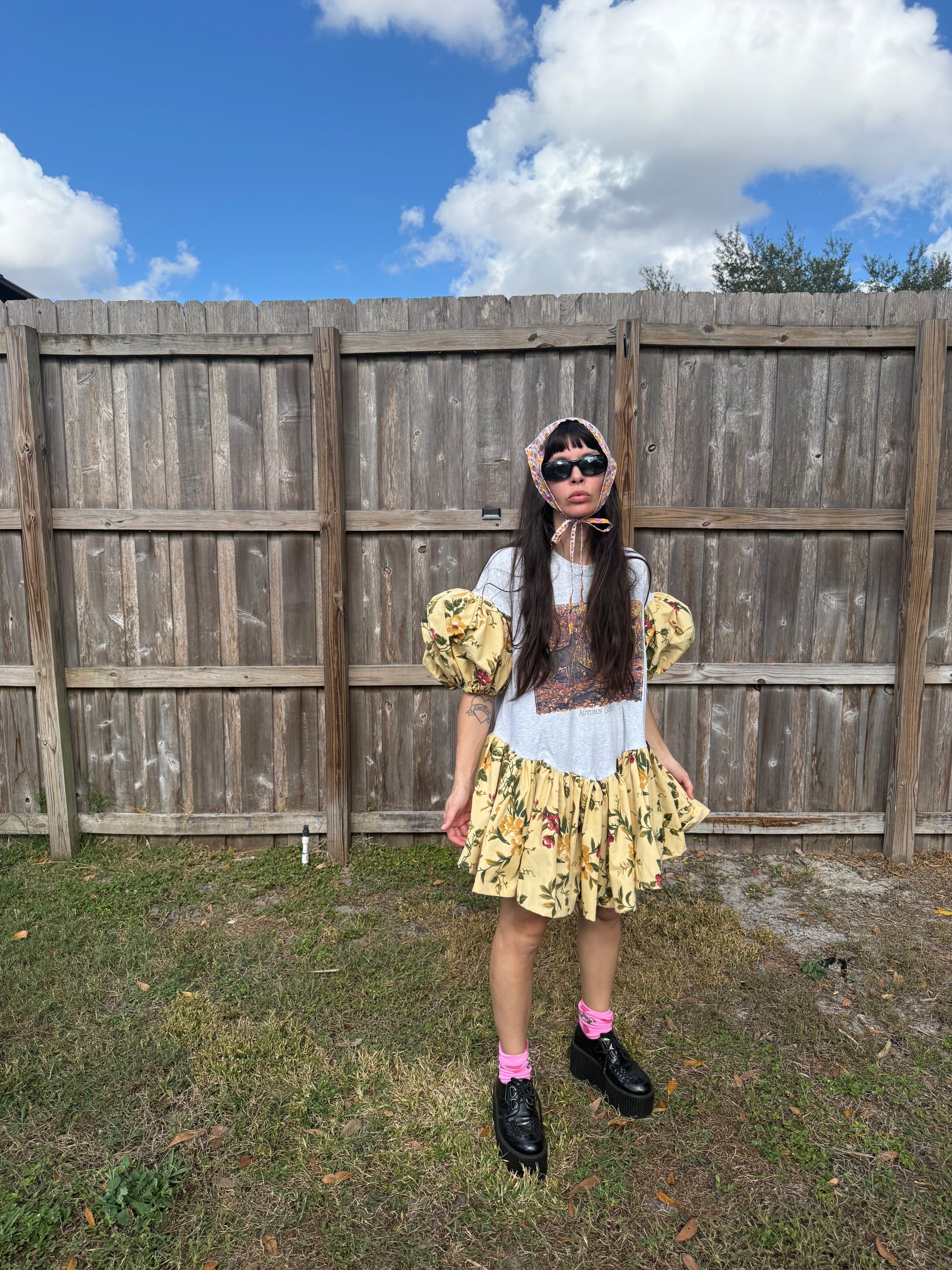 Vintage Sleep tshirt originally 3x with added puff sleeves and ruffle at hem made from vintage floral cur twins. Sleep shirt slightly take in at sides and ruffle comes to a V in front and back for a more feminine fit.