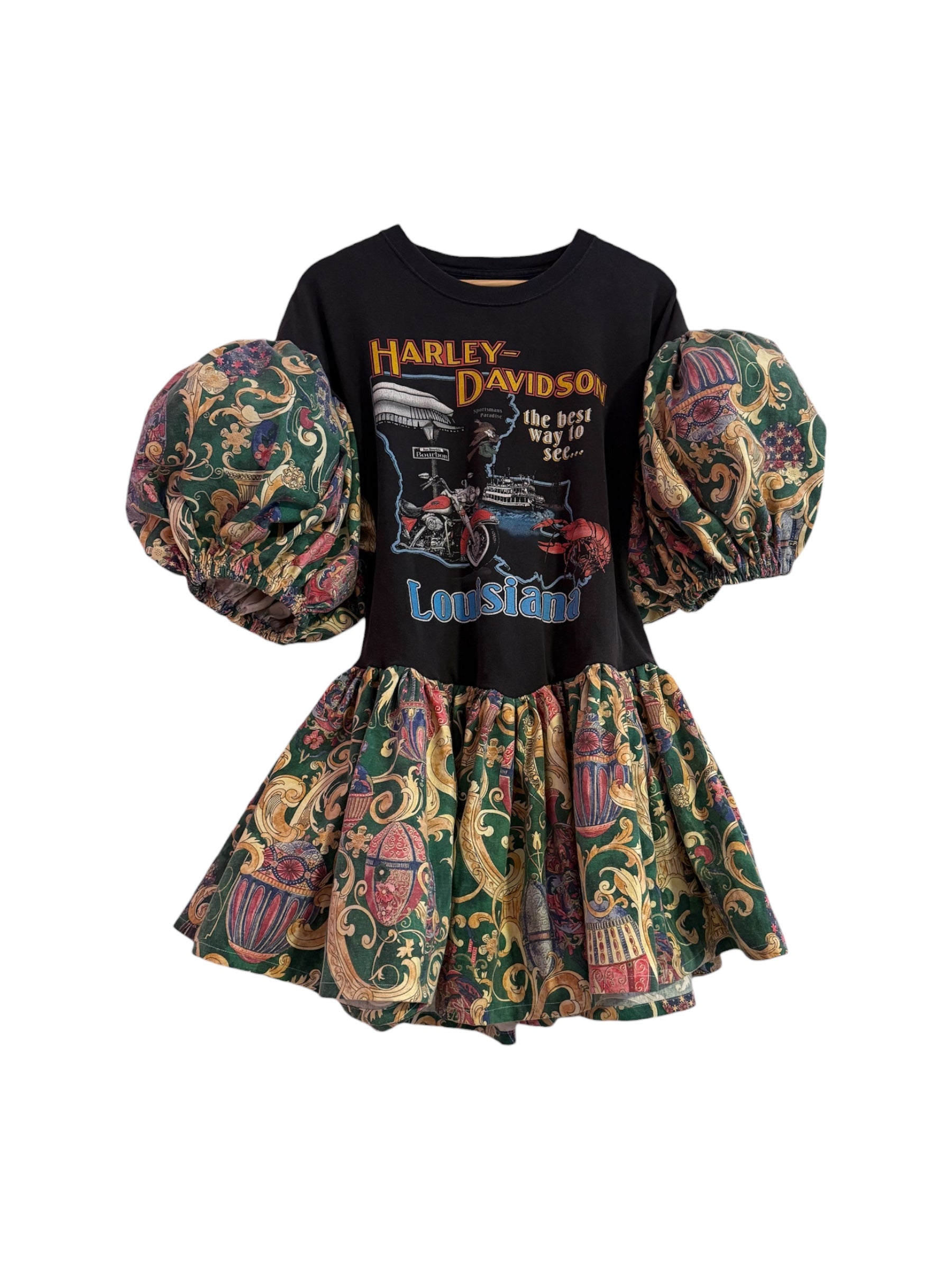 Vintage Sleep t-shirt originally size XL with added puff sleeves and ruffle at hem made from vintage table cloth. Shirt is slightly taken in at sides and ruffle comes to a V in front and back for a more feminine fit.