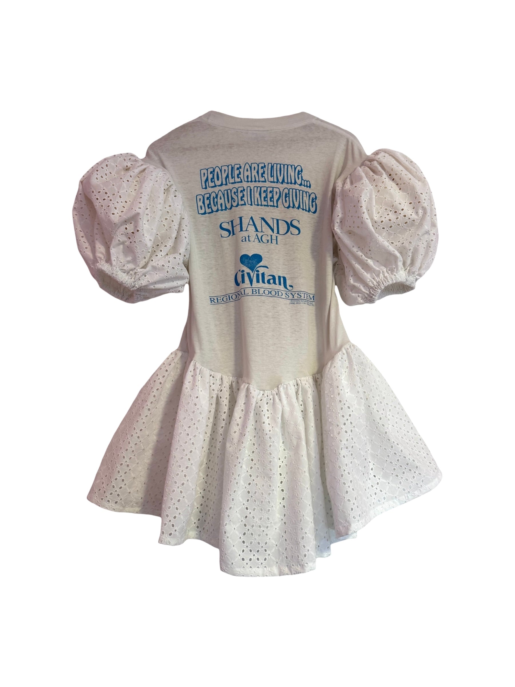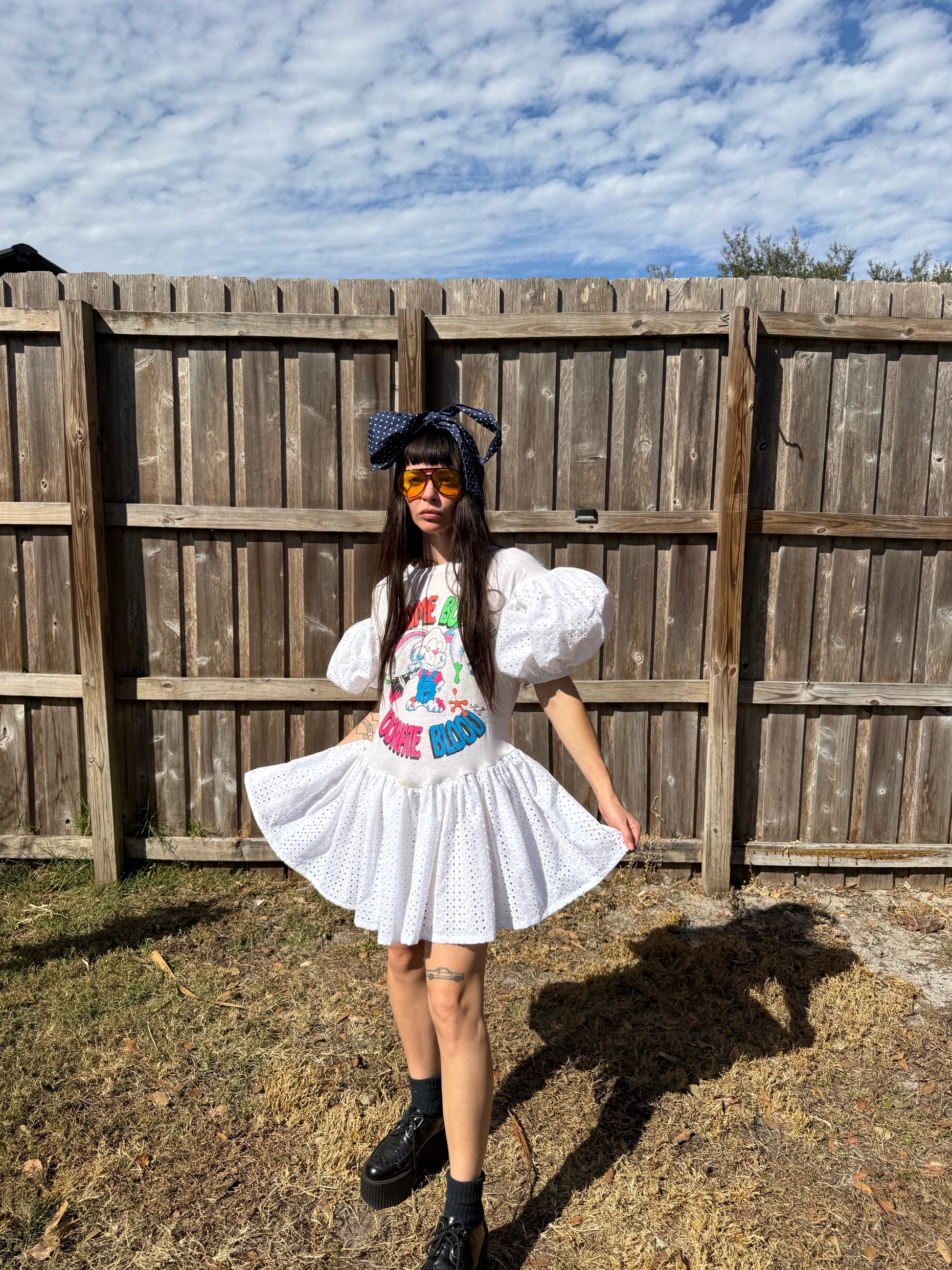 Vintage Sleep t-shirt originally size 2XL with added puff sleeves and ruffle at hem made from whits cotton eyelet fabric. Shirt is slightly taken in at sides and ruffle comes to a V in front and back for a more feminine fit.