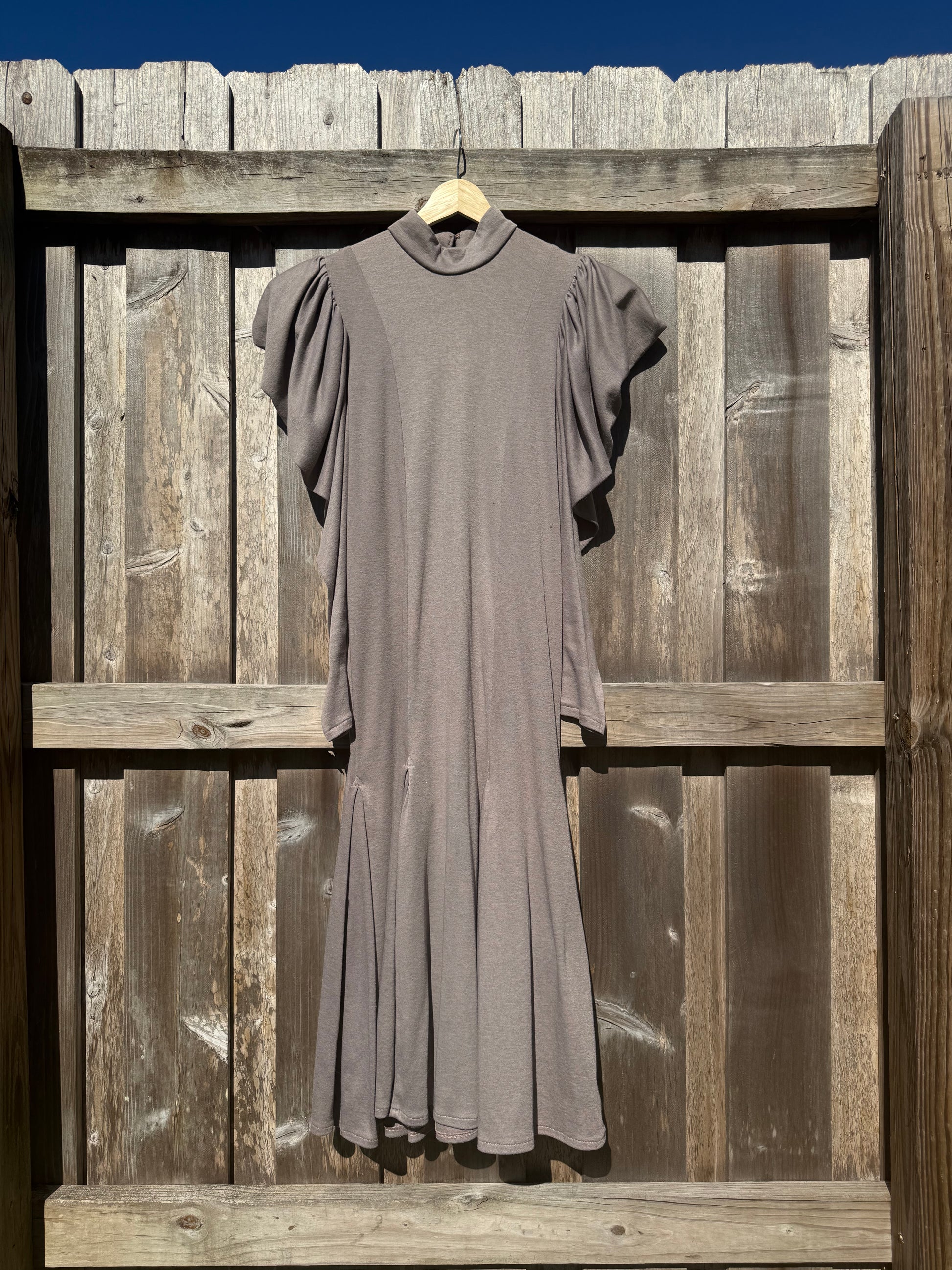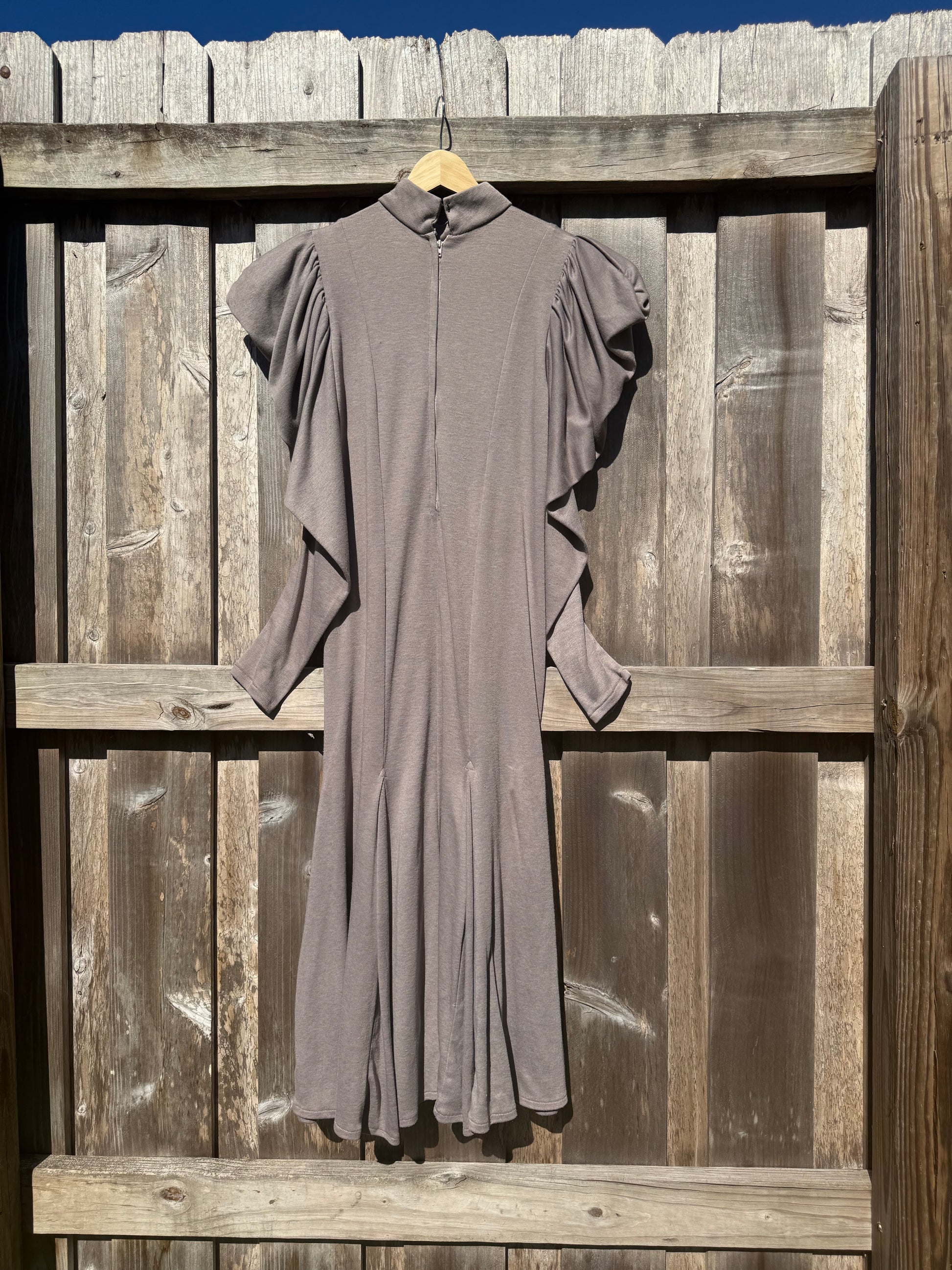 Vintage Lorrie Kabala dress with mock neck and long puff sleeves. Make from a stretchy jersey like cotton. It used to be a beige color but had stains so I dyed her a beautiful shade of taupe.