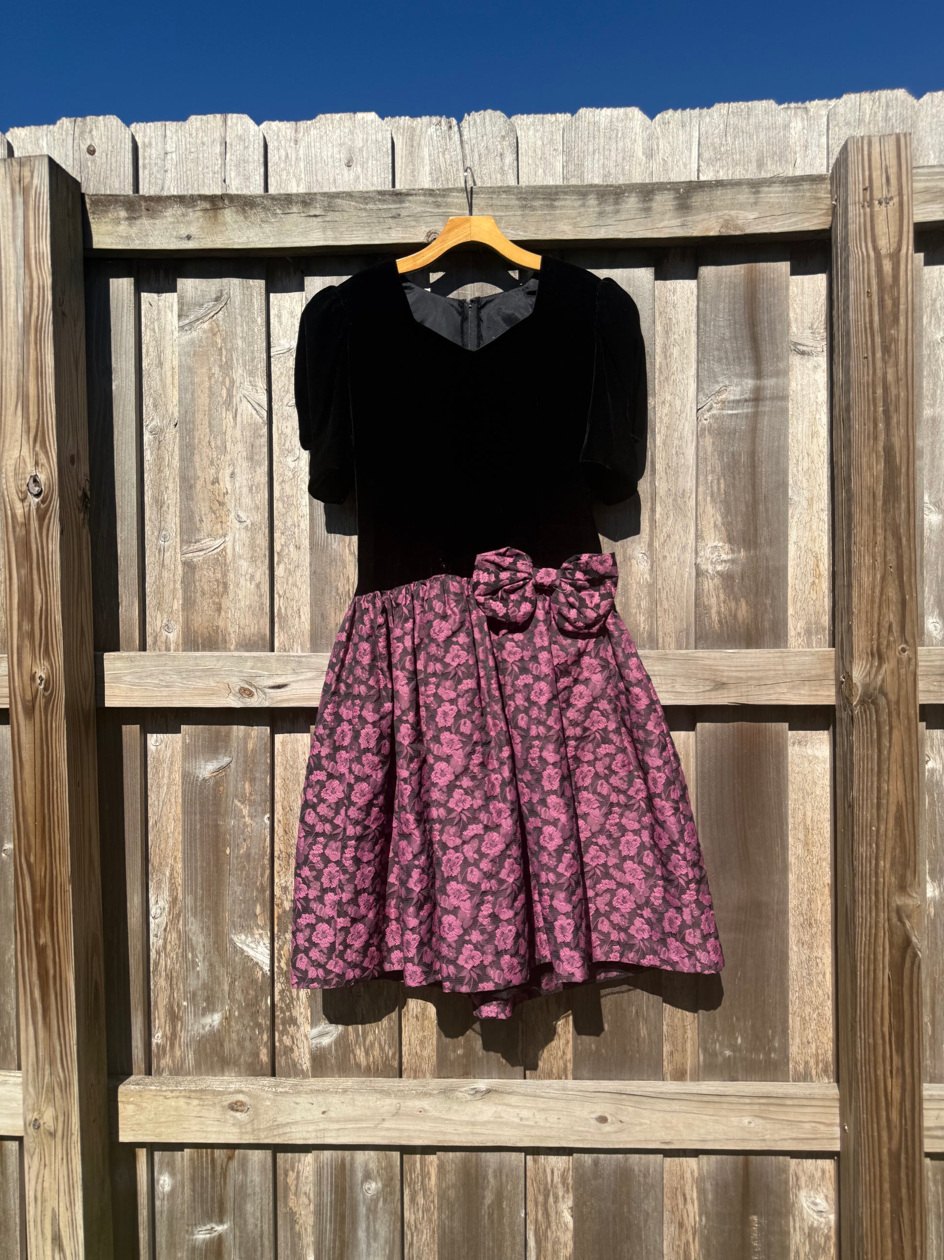 Vintage velvet and taffeta dress with sweetheart neckline, puff sleeves, and bow sew to hip. Made from beautiful velvet on the top and taffeta skirt lined with tulle.